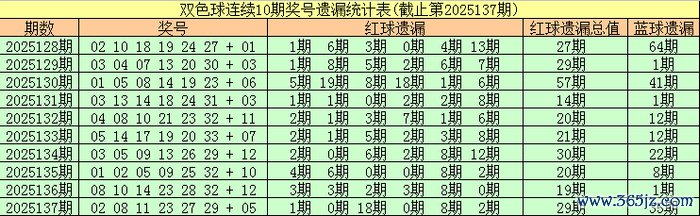 罢休双色球第2025137期,最近10期红球遗漏总值区分为:27期、29期、57期、14期、20期、21期、30期、20期、19期、29期,上期遗漏总期数偏高。